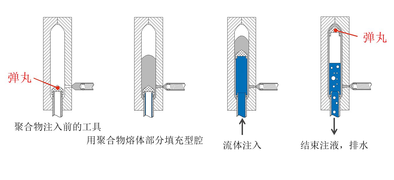 首先,型腔完全充满了熔体,然后在引入流体之前就打开了溢流口。流体将液态熔体直接置换回注塑机的前室。被推回的材料位于螺杆前室的前面,并在下一个循环中形成后续组件的外壳。
